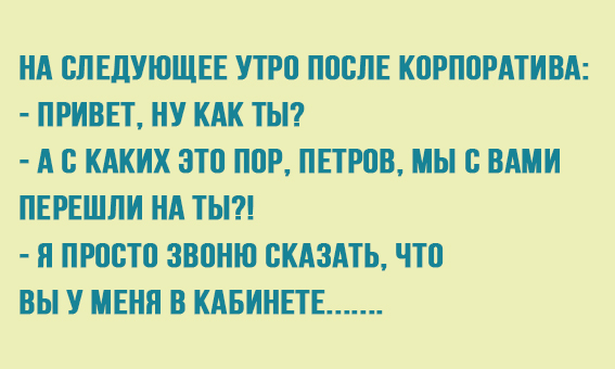 Иногда корпоративы на работе завершаются совсем не так, как думалось изначально. Именно об этом наш сегодняшний анекдот. Но окончание истории довольно веселое, поэтому советуем прочитать анекдот
