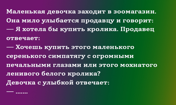 Анекдот про кроликов Поделиться на FacebookПоделиться в PinterestПоделиться в ВКПоделиться в ОКПоделиться в Twitter Для того,чтобы анекдот был хорошим он должен быть веселым и содержать совершенно неожиданную развязку.Сегодня у нас именно такие анекдоты. Хорошего вам настроения!Читай продолжение на следующей странице 1 2 Читать дальше →
