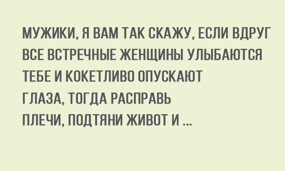 Анекдот про мужчин Поделиться на FacebookПоделиться в PinterestПоделиться в ВКПоделиться в ОКПоделиться в Twitter Отличные анекдоты помогают нам смеяться от души, поднимают настроение и дарят позитив, которого иногда так не хватаетЧитайте наши анекдоты и получайте настоящее удовольствие!Читай продолжение на следующей странице 1 2 Читать дальше →