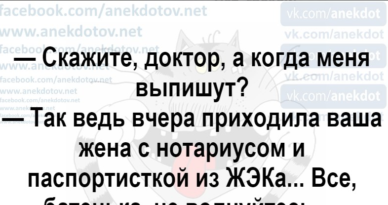 Анекдот про мужика в больнице Поделиться на FacebookПоделиться в PinterestПоделиться в ВКПоделиться в ОКПоделиться в Twitter Если вы любите смешные анекдоты — это к нам. У нас немало смешных анекдотов, которые развеселят вас и оставят настроение просто отличным.Читайте и получайте удовольствие!Читай продолжение на следующей странице 1 2 Читать дальше →