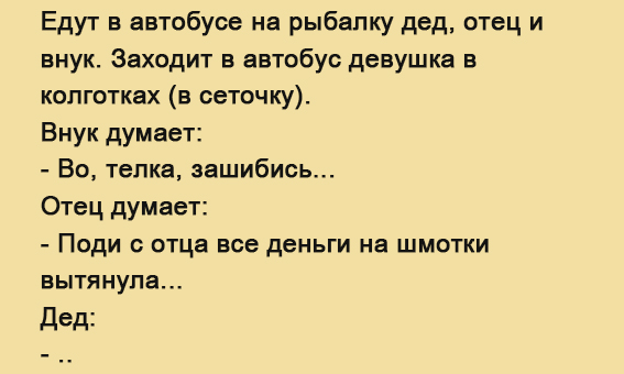 С возрастом меняются мысли и желания. Даже на такие простые вещи, как колготки на девушке, три разных поколения смотрят по разному. А вот как — узнавайте из нашего нового анекдота