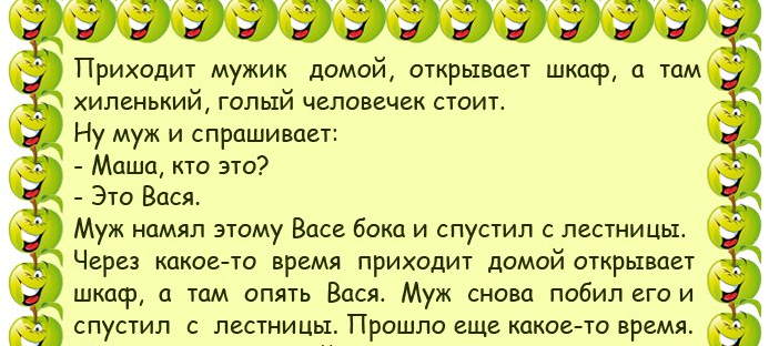 Анекдоты дня Поделиться на FacebookПоделиться в PinterestПоделиться в ВКПоделиться в ОКПоделиться в Twitter Отличные анекдоты помогают нам смеяться от души, поднимают настроение и дарят позитив, которого иногда так не хватаетЧитайте наши анекдоты и получайте настоящее удовольствие!Читай продолжение на следующей странице 1 2 Читать дальше →