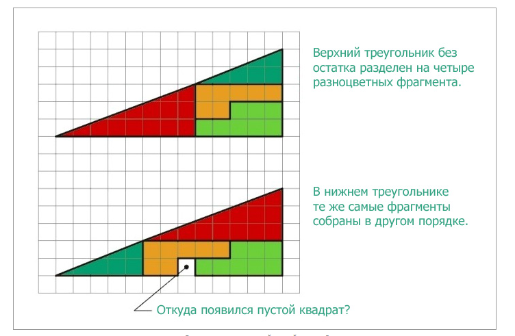 Перед вами два треугольника. Тот, который находится выше — разделен без остатка на четыре фрагмента. А вот в нижнем те же самое фрагменты, но в другом порядке. Откуда взялся лишний пустой квадрат?