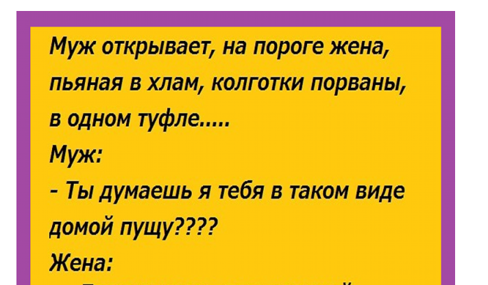 А вам приходилось ждать свою половину после ночных гулянок? Муж из анекдота долго ждал свою жену и, кажется, уже готов начать читать ей лекции. Но все пошло немного не так, как было запланировано…