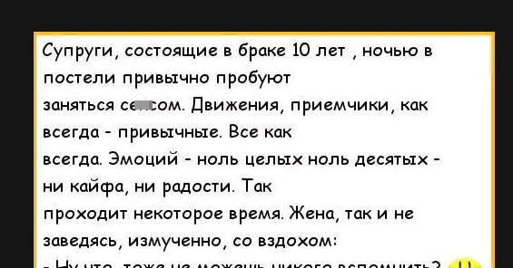 Смешные анекдоты — это очень веселые и короткие рассказы с остроумным окончанием. Сегодня у нас слегка правдивый рассказ о семейной паре со стажем. Поэтому он и веселит многих Нам было очень весело