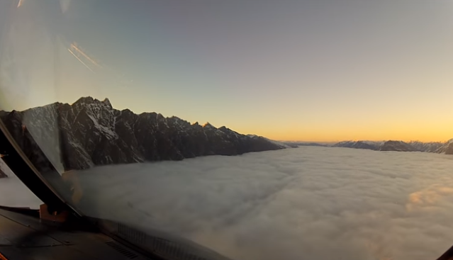Камера в кабине засняла момент приземления самолета в город Квинзтаун, который находится в Новой Зеландии.