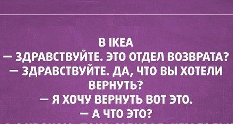 Правдивый анекдот про икею Поделиться на FacebookПоделиться в PinterestПоделиться в ВКПоделиться в ОКПоделиться в Twitter А вам доводилось собирать мебель из Икеа? Если да, то вы поймёте героя нового анекдота Читай продолжение на следующей странице 1 2 Читать дальше →