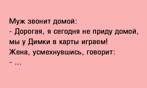 Смешной анекдот про разговор мужа и жены Поделиться на FacebookПоделиться в PinterestПоделиться в ВКПоделиться в ОКПоделиться в Twitter Отличные анекдоты помогают нам смеяться от души, поднимают настроение и дарят позитив, которого иногда так не хватаетЧитайте наши анекдоты и получайте настоящее удовольствие!Читай продолжение на следующей странице 1 2 Читать дальше →