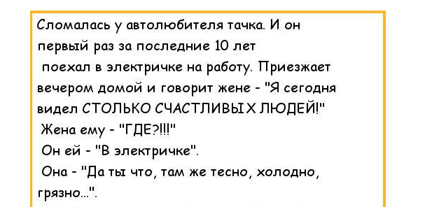 Кажется иногда, что счастье в малом. И герой нашего анекдота, кажется понял это самым простым способом — просто попробовал немного изменить свою жизнь. Советуем вам попробовать сделать так же и возможно вы найдете свое счастье в обычных вещах