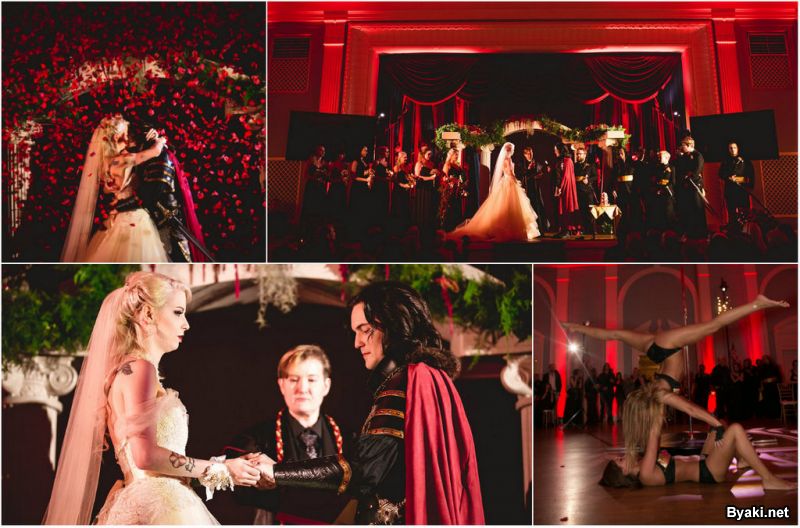 Пара, которая считается королем и королевой городского сообщества вампиров, решила показать ее в своей церемонии. Жених был с клыками и в доспехах по образцу фильма о культе крови. Невеста носила традиционное белое платье, а также корону и букет красных цветов.