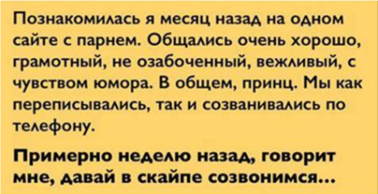 История сегодня у нас просто очень смешная. Причем она вполне реалистичная, потому что такое могло произойти с кем угодно. Но мы все же советуем всем — если знакомитесь в интернете, то внимательно следите за средствами связи